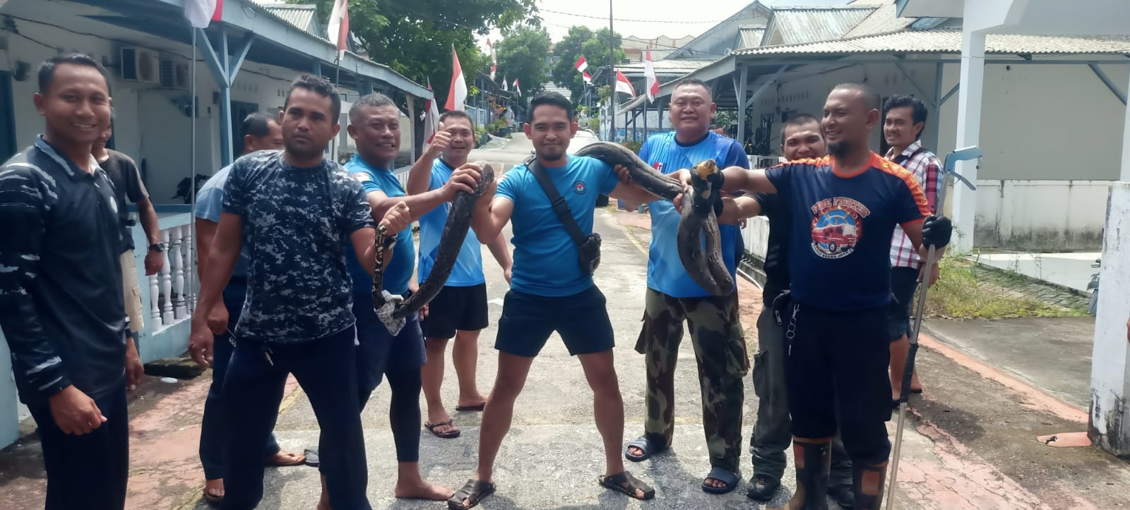 Pasi Intel Lanal Tbk, Kapten Laut (E) M Amir Mahmud bersama Tim Damkar Karimun usai berhasil menangkap ular sepanjang 4,2 meter di Perumahan Komplek TNI AL. Foto Istimewa